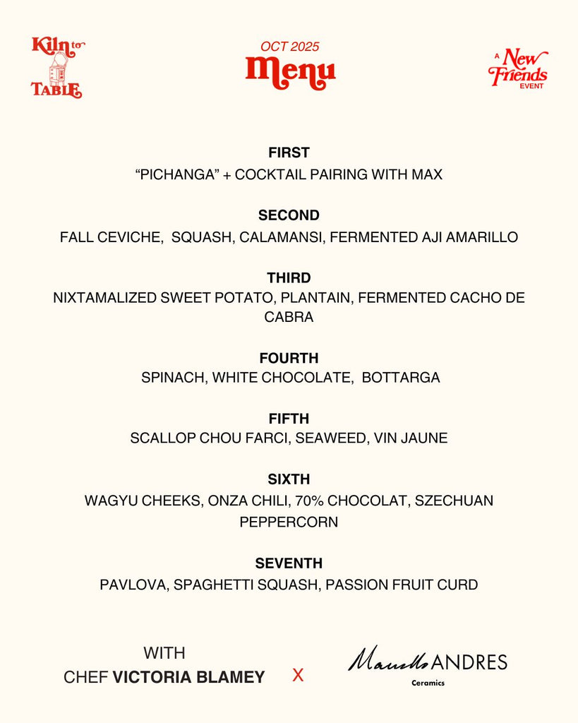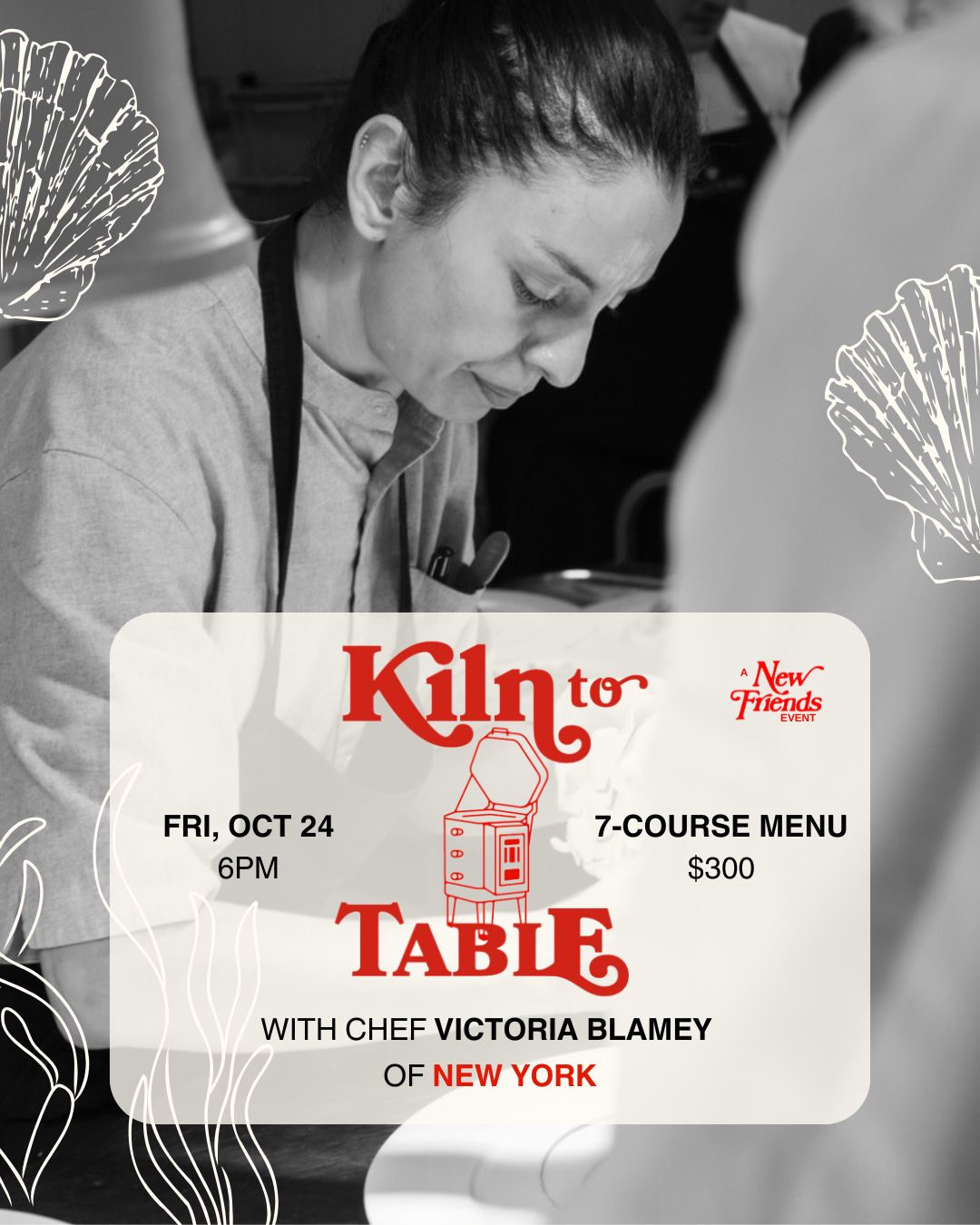 Our next Kiln to Table dinner features lauded chef and friend of the studio Victoria Blamey of New York by way of Chile. Her cooking experience includes a two-Michelin star restaurant near London and the globally acclaimed Mugaritz in San Sebastian. Most recently, she was the executive chef at Blanca, No. 2 on New York Times' Best Restaurant list in 2024.