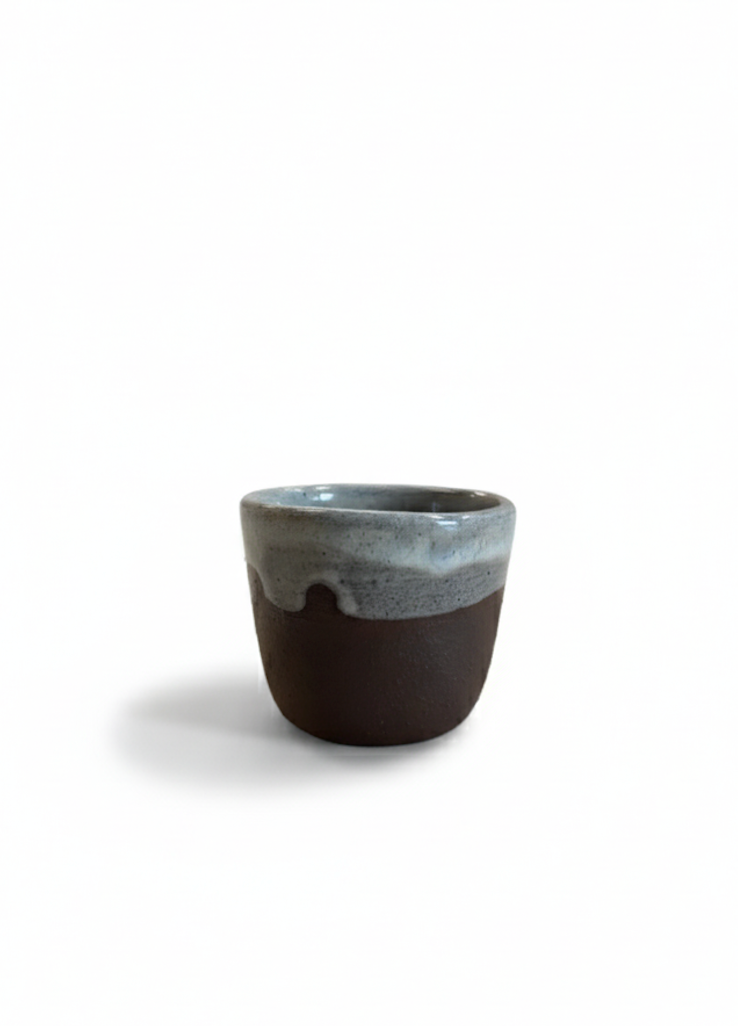 Our Brown Porcelain collection features a proprietary clay body made in-house, unique to our studio. Deep and earthy, the dark tone alludes to the beauty of rich Texas soil on a rainy day. This 5 oz cup is finished in our House White glossy glaze—applied fully to the interior and partially to the exterior to showcase the raw, dark clay beneath.