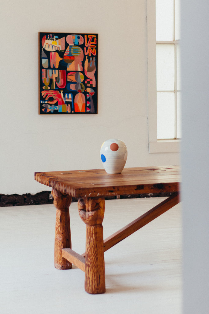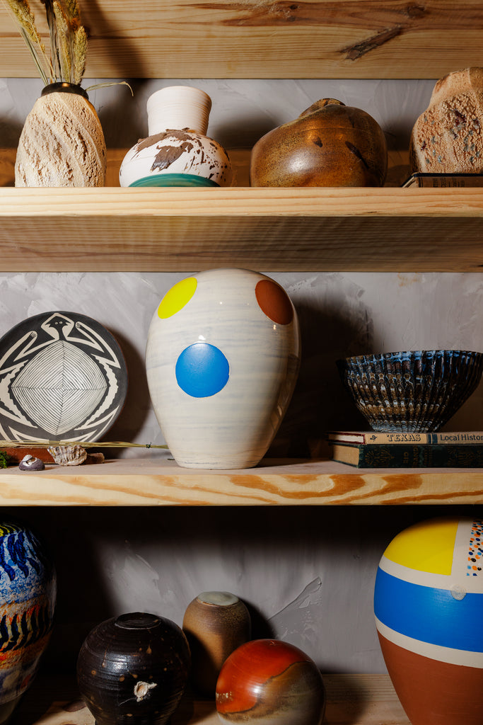 On October 10–12, 2025, ceramic artist Marcello Ortega debuted a new collection of large porcelain orbs which explore the tension of air and inflation in clay. He showed this new series of untitled work at his joint show, 'The Long Game' with fellow Dallas-based artist Kyle Steed at the Do Right Hall in Marfa, TX.